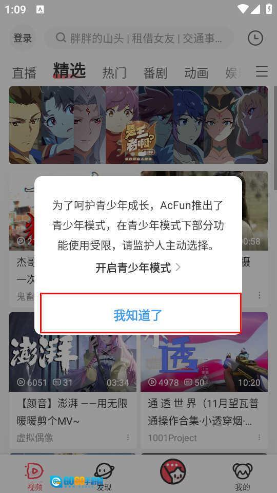 打开软件后点击“我知道了”,注意不要开启青少年模式,一旦开启会导致部分高能内容无法访问。