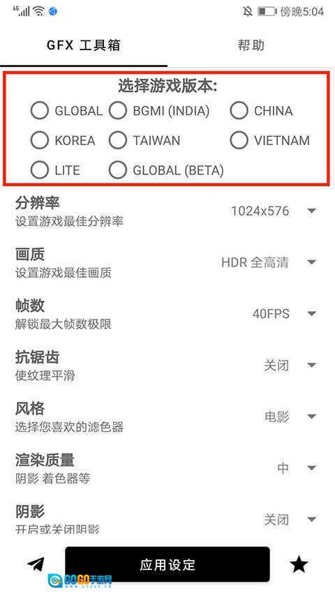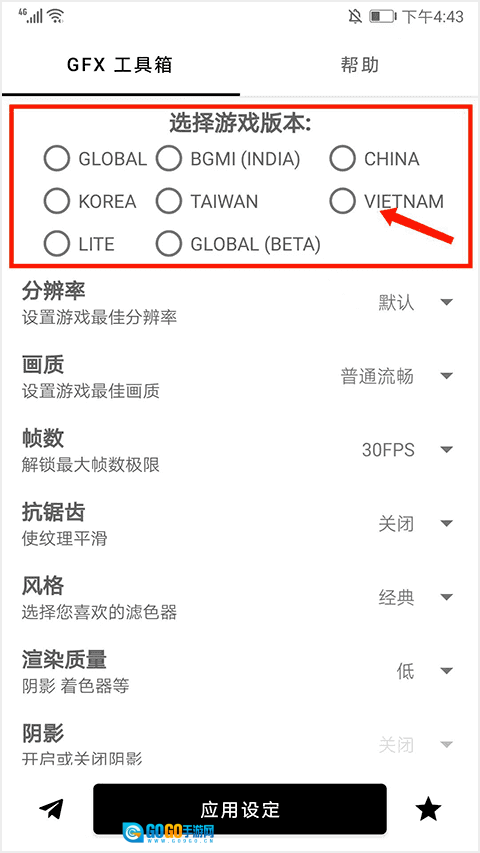 1、打开gfx工具箱,进入应用主界面后,先选择要修改的游戏版本,该工具箱支持国服、越南服、印度服、韩服、台服等八个版本,本次操作以【越南服】为例,