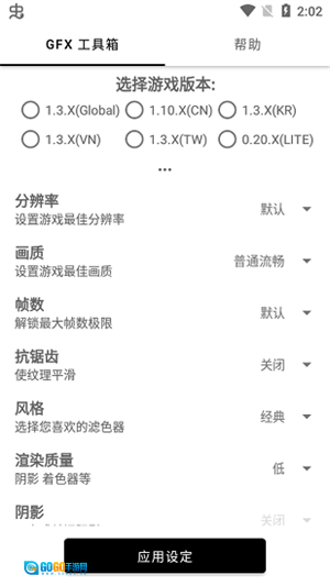 2、如图所示,若工具箱主界面上方的游戏版本栏不再显示,意味着游戏版本已选定完成。之后只需设置好分辨率、画质、帧数等参数选项,再点击下方的【应用设定】按钮,就能保存这些设置了。