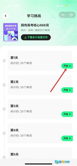 在学习挑战页面,点击第1关的开始按钮,即可进入单词学习页面。
