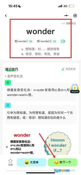 学习完当前单词后,只需点击“秒下一个”按钮,就能继续学习下一个单词。