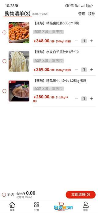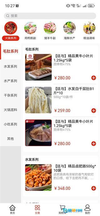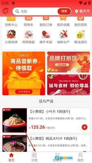 在廷与食材速冻鲜品选购首页,点击底部的分类选项,即可进入分类页面。