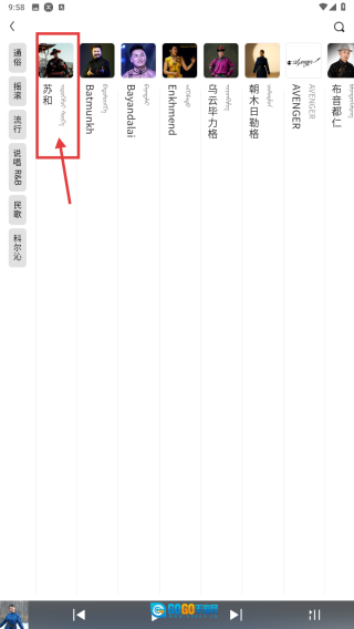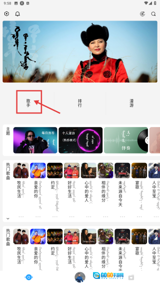 打开音乐类,点击歌手选项,进入歌手列表页面。