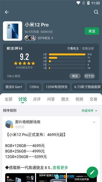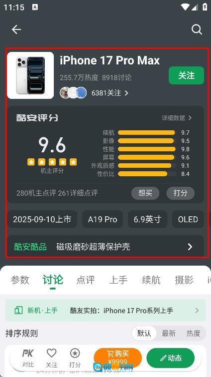 在手机详情页面,能够查看这款手机的酷安评分、上市时间等相关信息。