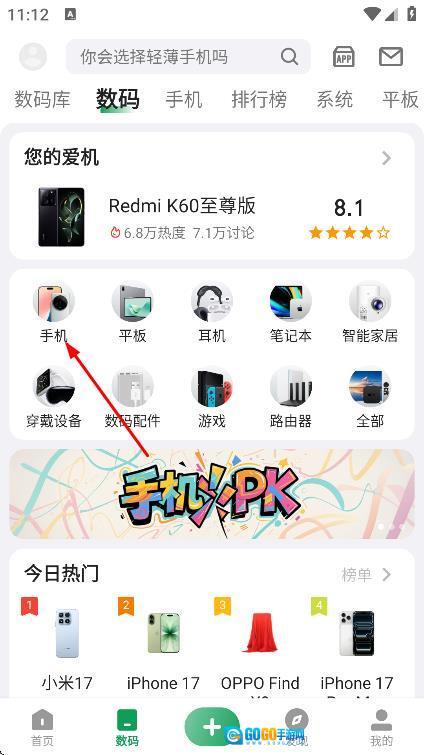 在数码页面,点击手机,进入数码分类手机的页面。
