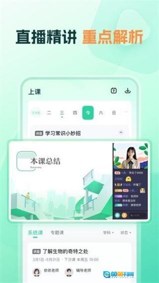 为中小学生打造覆盖全学科的直播精讲课程,配备实时连麦互动、弹幕在线提问、随堂小测验等多样化功能,授课老师能够及时解答学生疑问,打破录播课程单向传递知识的限制,助力学生在课堂上更专注,有效提高学习效率。