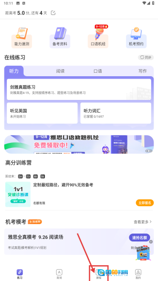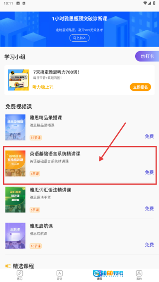 打开雅思学习应用,点击底部的课程选项,进入课程推荐页面。