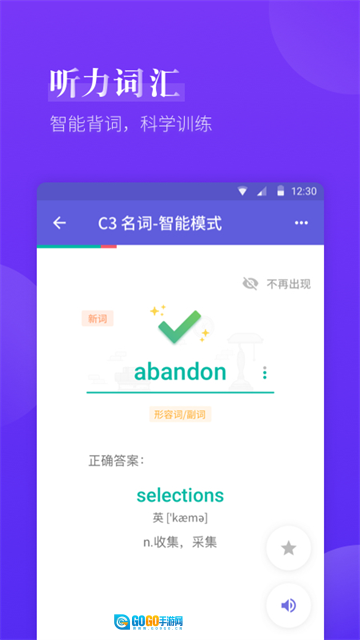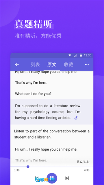 逐句精听功能:专门为听力模块打造逐句精听训练,可反复听读、跟读模仿,助力考生突破听力难关,增强捕捉关键信息和理解语境的能力。