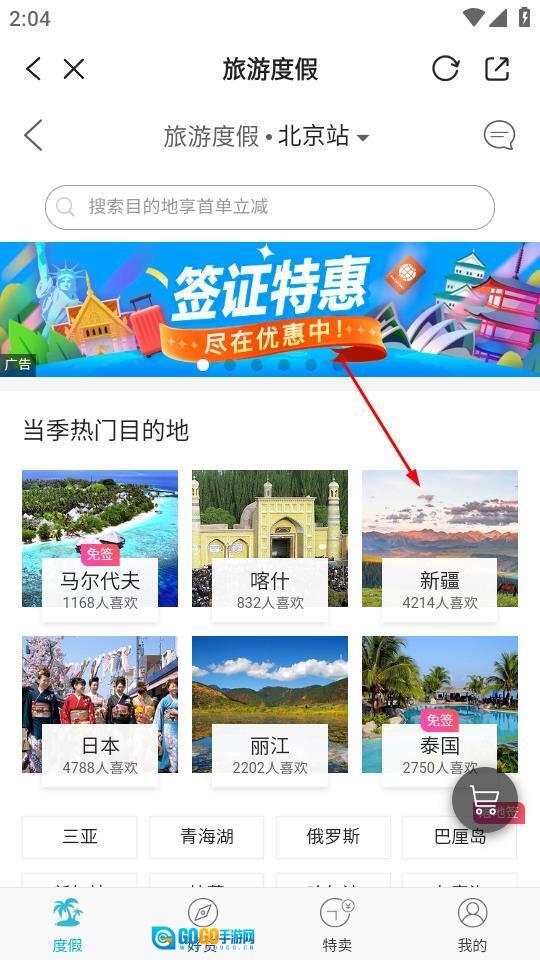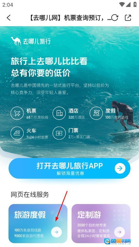 在该页面,点击旅游度假选项,进入旅游度假页面。