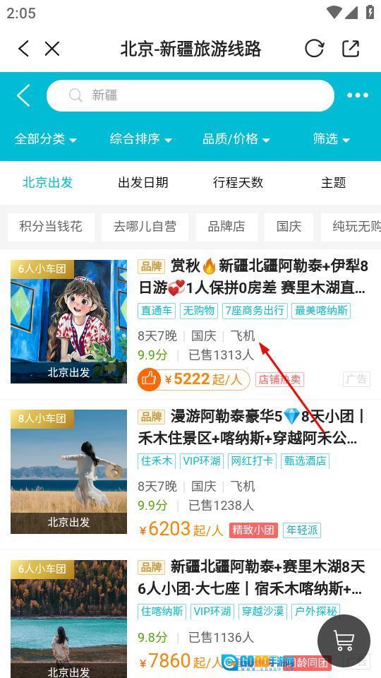 在旅游度假页面,选定新疆作为目的地后,即可进入北京出发的新疆旅游线路页面。
