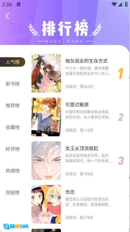榜单页面根据当前热度将漫画进行了排序。