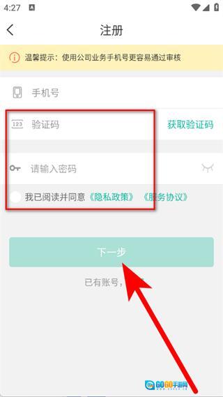 输入验证码并设置密码,勾选相关选项后,点击“下一步”按钮,即可完成注册流程。
