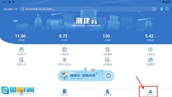 打开湘建云应用,点击底部的用户中心选项,即可进入个人中心页面。