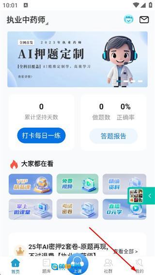 在执业中药师页面,点击底部的“我的”选项,即可进入个人中心页面。