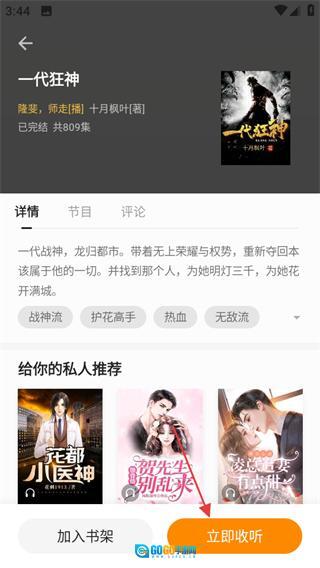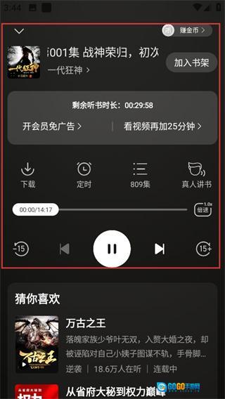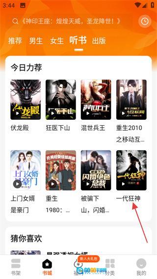 在听书页面挑选你想听的书籍,比如《一代狂神》,然后进入该书的详情页面。