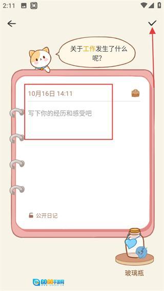 在经历与感受的填写页面完成内容撰写后,点击右上角的对勾图标,即可进入心情封装页面。