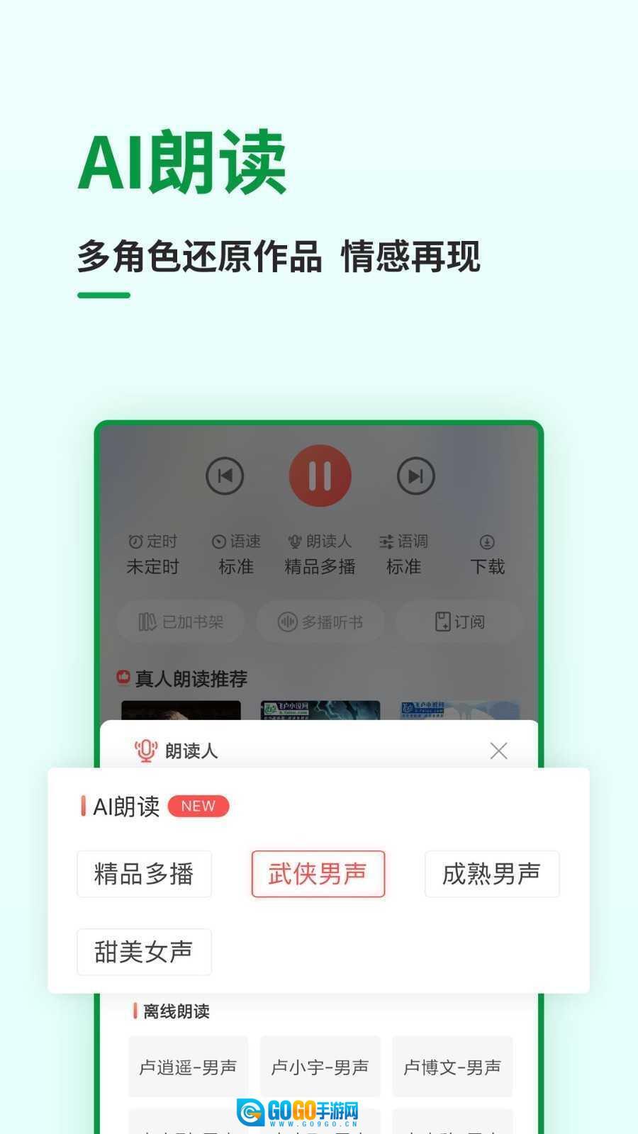 软件具备听书功能,用户能够开启AI朗读,还支持多角色对话朗读、真实场景音效以及情景再现功能。