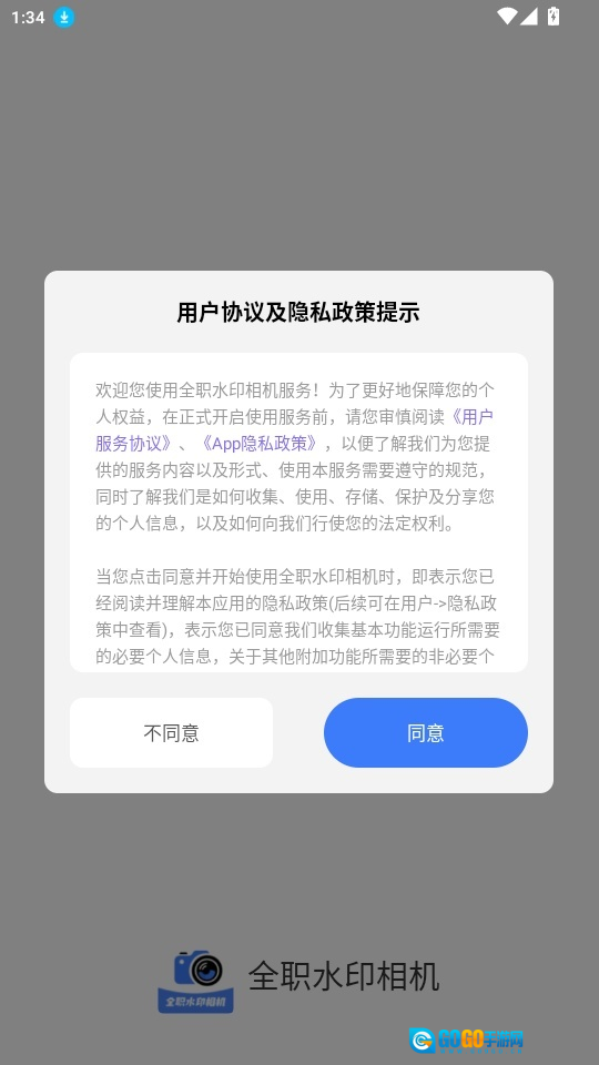 1. 启动软件后,阅读“用户协议及隐私政策提示”,点击“同意”按钮进入下一步。
