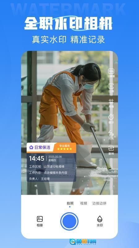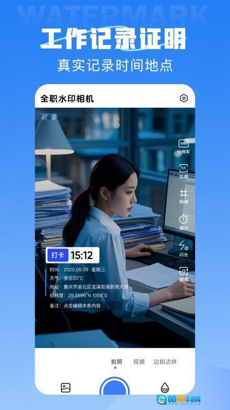 全职水印相机是一款高清专业的水印拍照软件,丰富的水印模板资源,涵盖考勤打卡、工程记录、物业管理等多种场景分类,能满足不同行业工作场景的拍照打卡需求。用户可自由选择适配的水印模板添加使用,借助实时定位水印拍照功能,精准记录拍摄现场的地点、日期、时间等真实信息,为日常打卡工作提供可靠支持,助力用户更真实地记录工作内容。软件还将所有水印照片集中到水印相册统一管理,方便用户快速查找。有需要的用户不妨来体验全职水印相机!