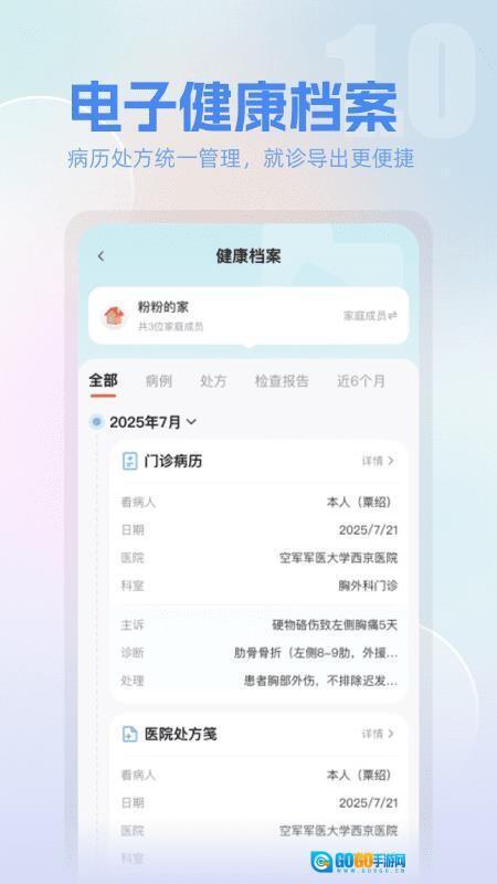 全家健康是一款助力用户管理家人健康的工具,用户可在软件内创建家人的健康数据,后续能便捷地导出数据供医生查看,以便医生更精准地开展医疗诊断,让家人享受到更优质的健康服务,从而更好地管理家人的健康信息。全家健康最新版新增了家庭药箱管理功能,支持设置每日用药提醒时间,确保家人准时收到用药提醒,引导他们按时用药,避免错过用药时间,助力家人规范用药,进而提升用药疗效。它是您家庭健康的贴心好助手,有需要的用户不妨来体验一下,开启更全面的健康管理吧!