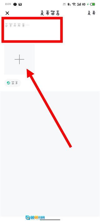 进入发布动态的页面后,在输入框里填写想要分享的内容,再点击+号添加图片。