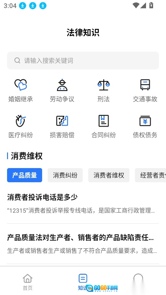 之后进入法律知识界面,就能找到消费维权知识板块,点击“知识内容”选项即可进入下一步操作。