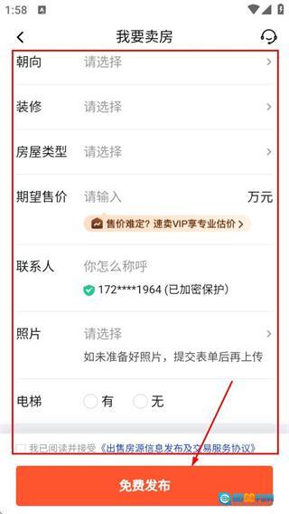 在“我要卖房”页面填写相关信息后,点击“免费发布”按钮,即可完成卖房信息的发布。