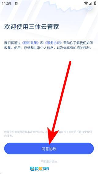 打开三体云管家后,在欢迎页面点击同意协议,即可进入登录选择页面。