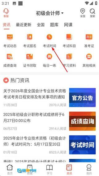 在资讯页面找到并点击“考试时间”选项,即可进入考试时间列表页面。