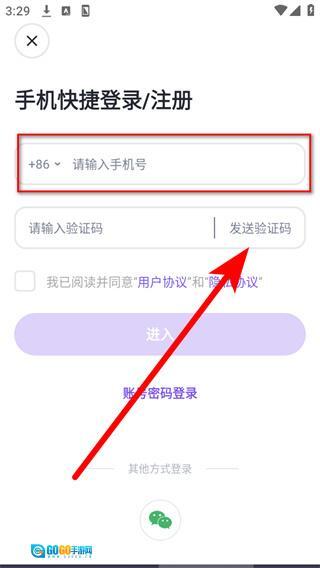把收到的短信验证码输入到验证码栏,勾选对应的协议后,点击进入按钮,就能完成登录操作。