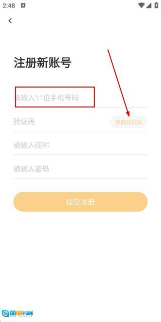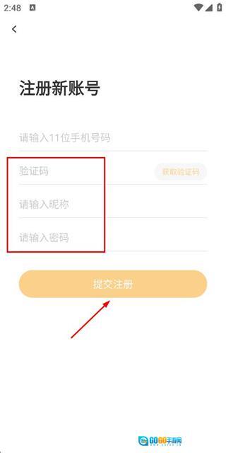 在注册账号页面依次填写验证码、昵称与密码,随后点击提交注册按钮,即可完成注册流程。