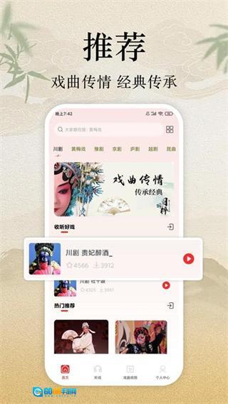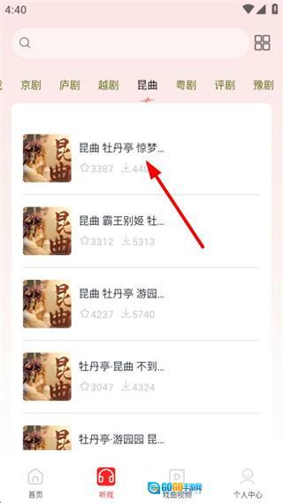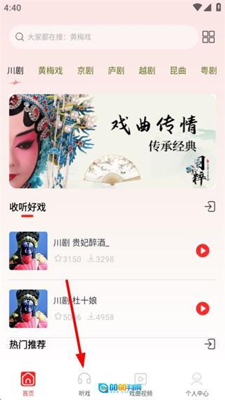 进入“看戏曲逛梨园”后,点击底部的“听戏”选项,即可进入听戏页面。