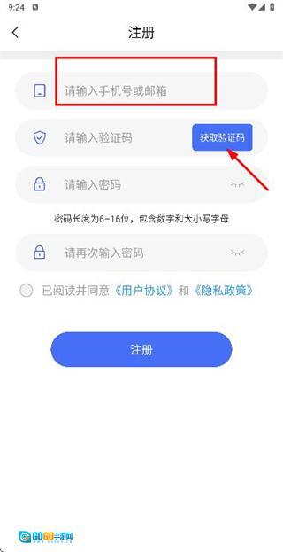在账号注册页面,依次填写验证码与密码,勾选相关协议后点击注册按钮,即可完成账号注册流程。