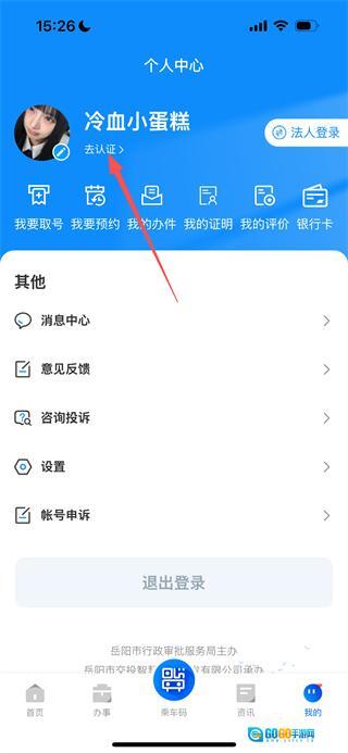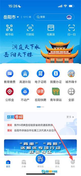 进入“岳办岳好”后,点击底部的“我的”选项,即可进入个人中心页面。