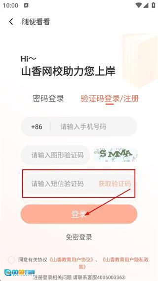 在验证码登录或注册界面,填写“请输入手机号码”对应的号码,以及对应的图形验证码。