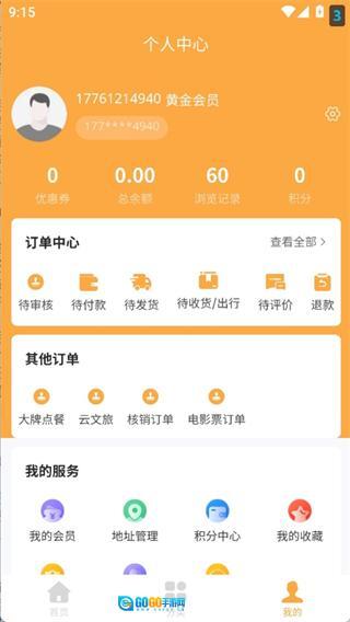 在宝石花旅游商城页面,点击底部的“我的”选项,即可进入个人中心页面。