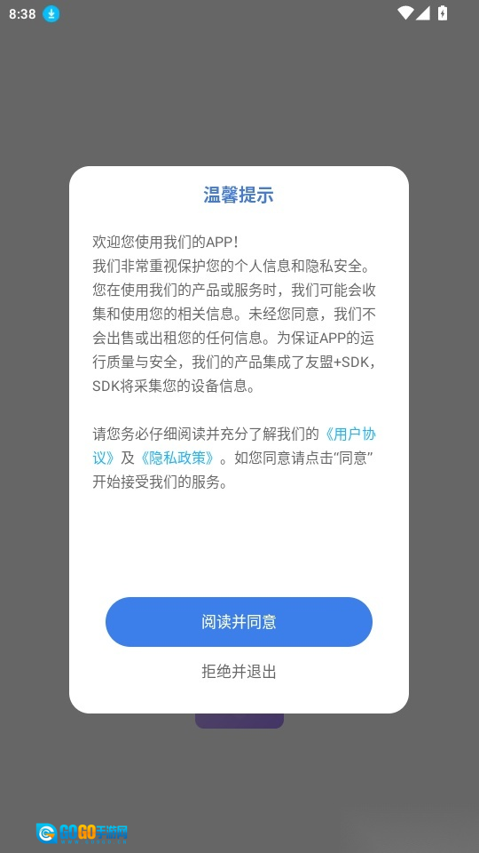 打开软件阅读“温馨提示”点击“阅读并同意”进入