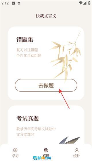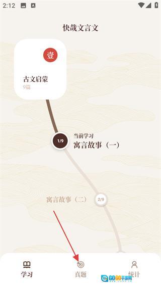 在快哉文言文学习页面,点击底部的真题选项,进入真题页面。