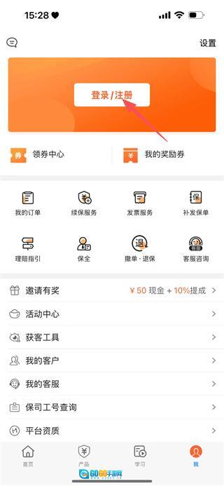 在个人中心页面,点击登录/注册按钮,即可进入登录选择页面。