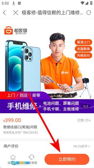 进入详情页后,点击页面下方的“立即预约”按钮,再根据提示填写相关信息,就能完成维修服务的预约流程。