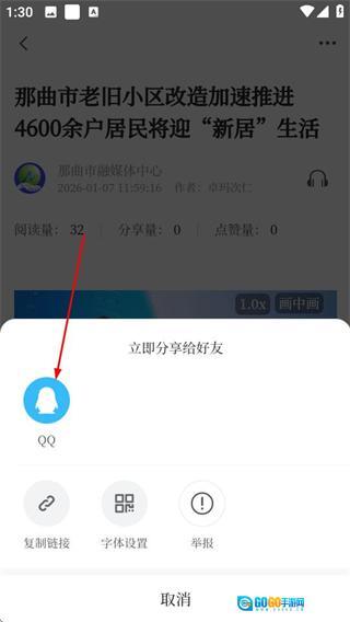 在分享选项弹窗中选择QQ选项,就能把这条新闻分享出去了。