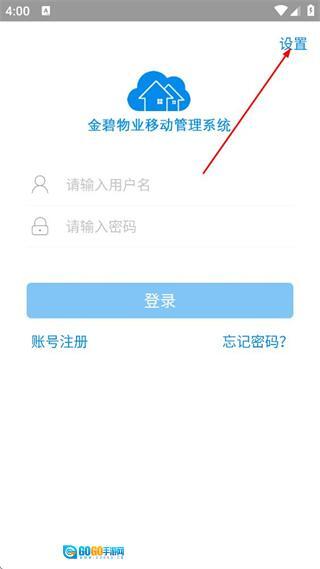 在金碧物业移动管理系统的登录界面,点击右上角的设置按钮,即可进入服务器设置页面。