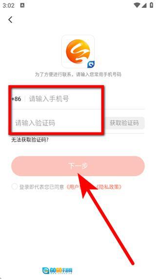 在注册页面,先输入手机号,接着点击获取验证码,然后点击下一步。