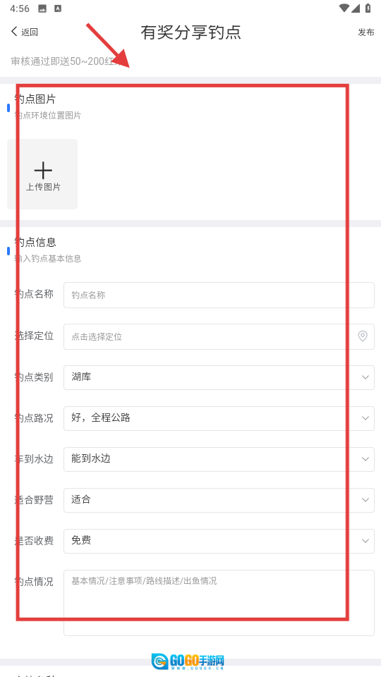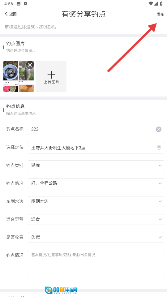 在表单页面,完成图片上传操作,并填写钓点名称、选择定位信息以及类别等内容。