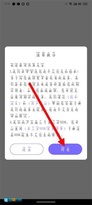 1、打开中国药典,在温馨提示弹窗中点击同意。