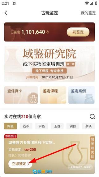 2、进入古玩鉴定页面后,点击“立即鉴定”按钮,即可跳转至鉴定操作页面。
