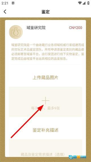 3、接下来我们可以进入鉴定页面,点击+号图标,上传藏品的图片。