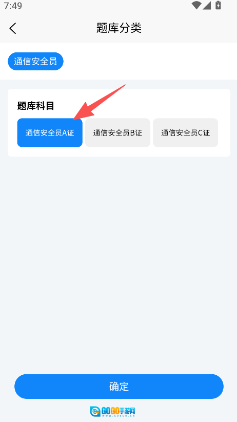 进入题库分类板块,挑选通信安全员A证、B证或者C证的对应科目,然后点击确定按钮。