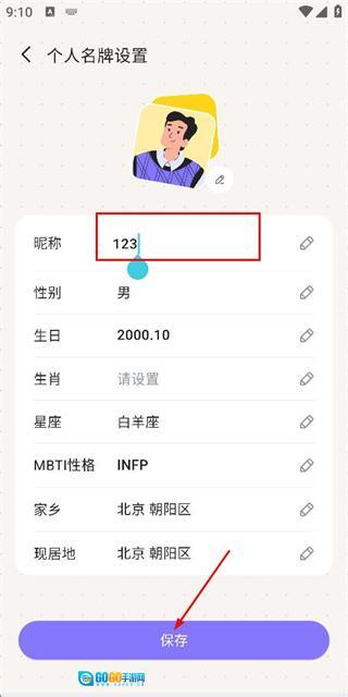 在个人名牌设置页面修改信息后,点击保存按钮即可完成个人信息的更新。