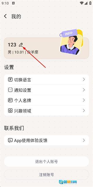 在个人中心页面,点击昵称旁边的编辑按钮,即可进入个人名牌设置页面。
